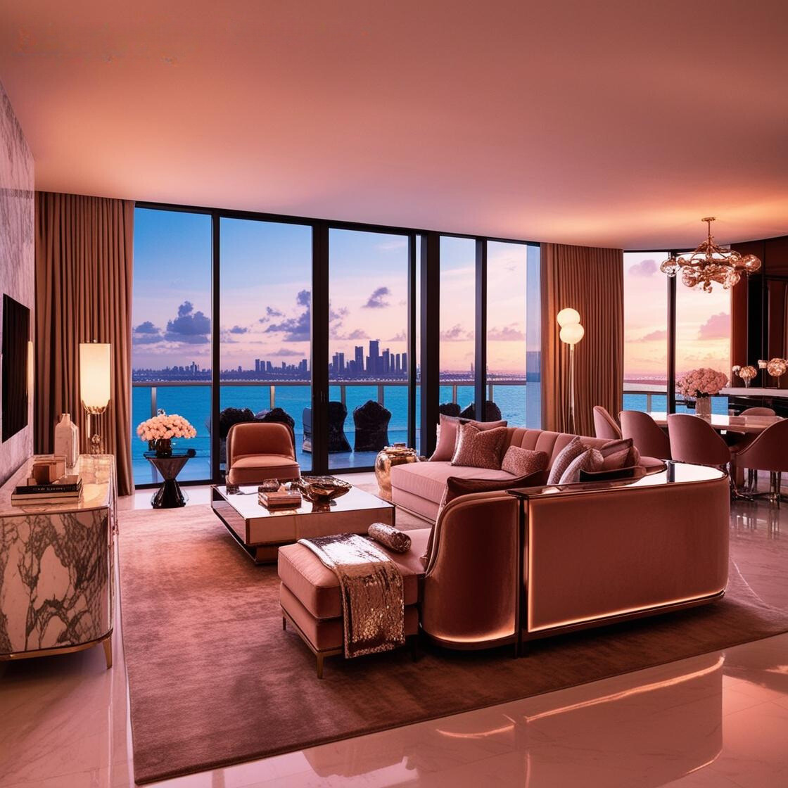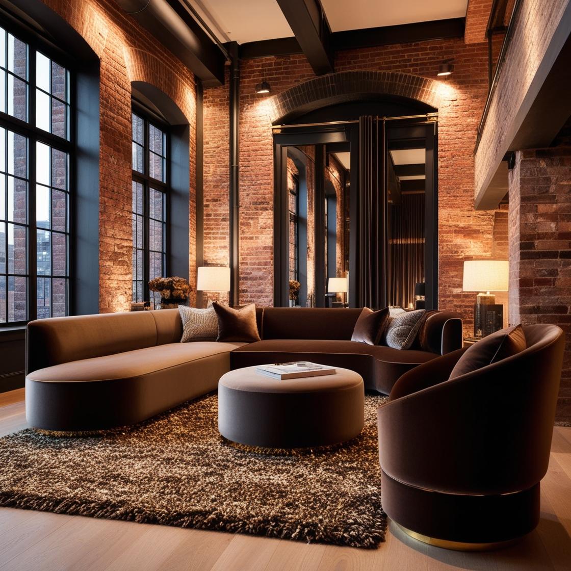 Heart of modern luxury with this stunning Miami loft condo, where sleek urban design meets cozy sophistication. The expansive, open-concept living space is anchored by a luxurious brown velvet couch, its rich, deep tones providing both warmth and a sense of timeless elegance amidst the loft’s industrial backdrop.